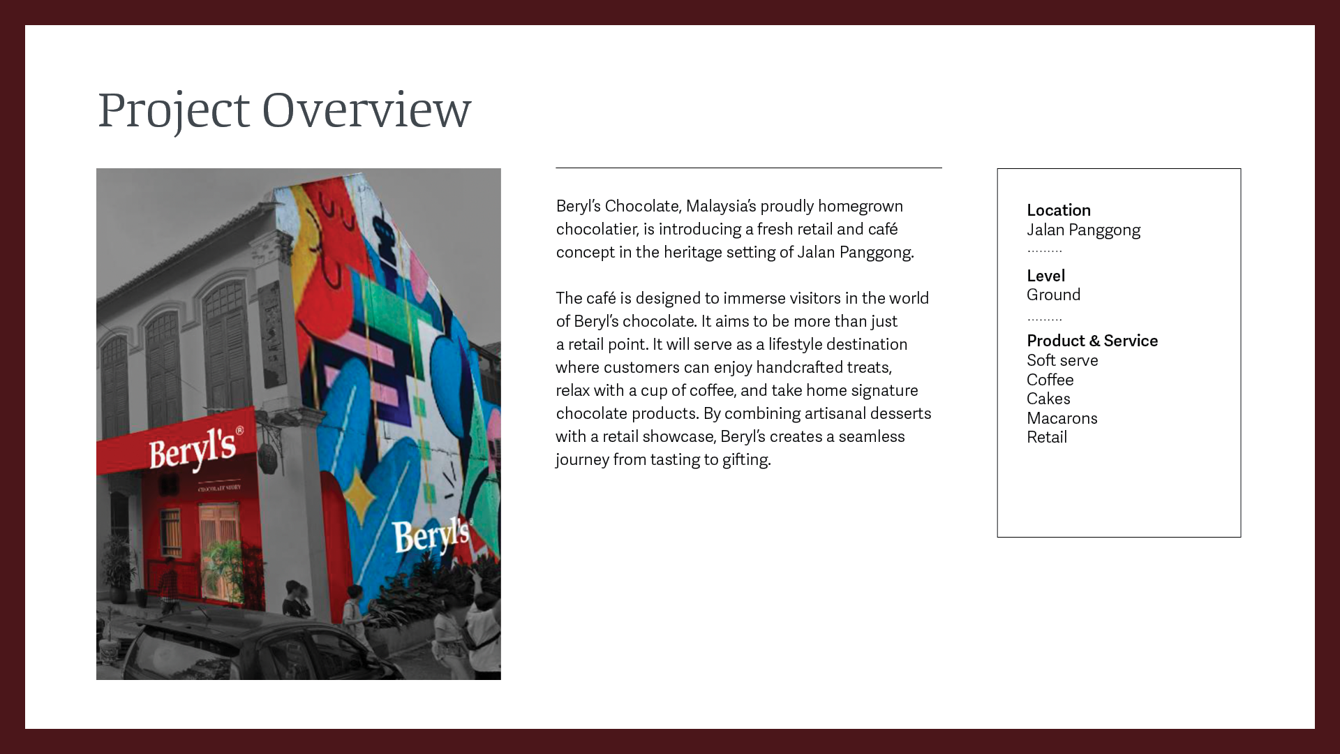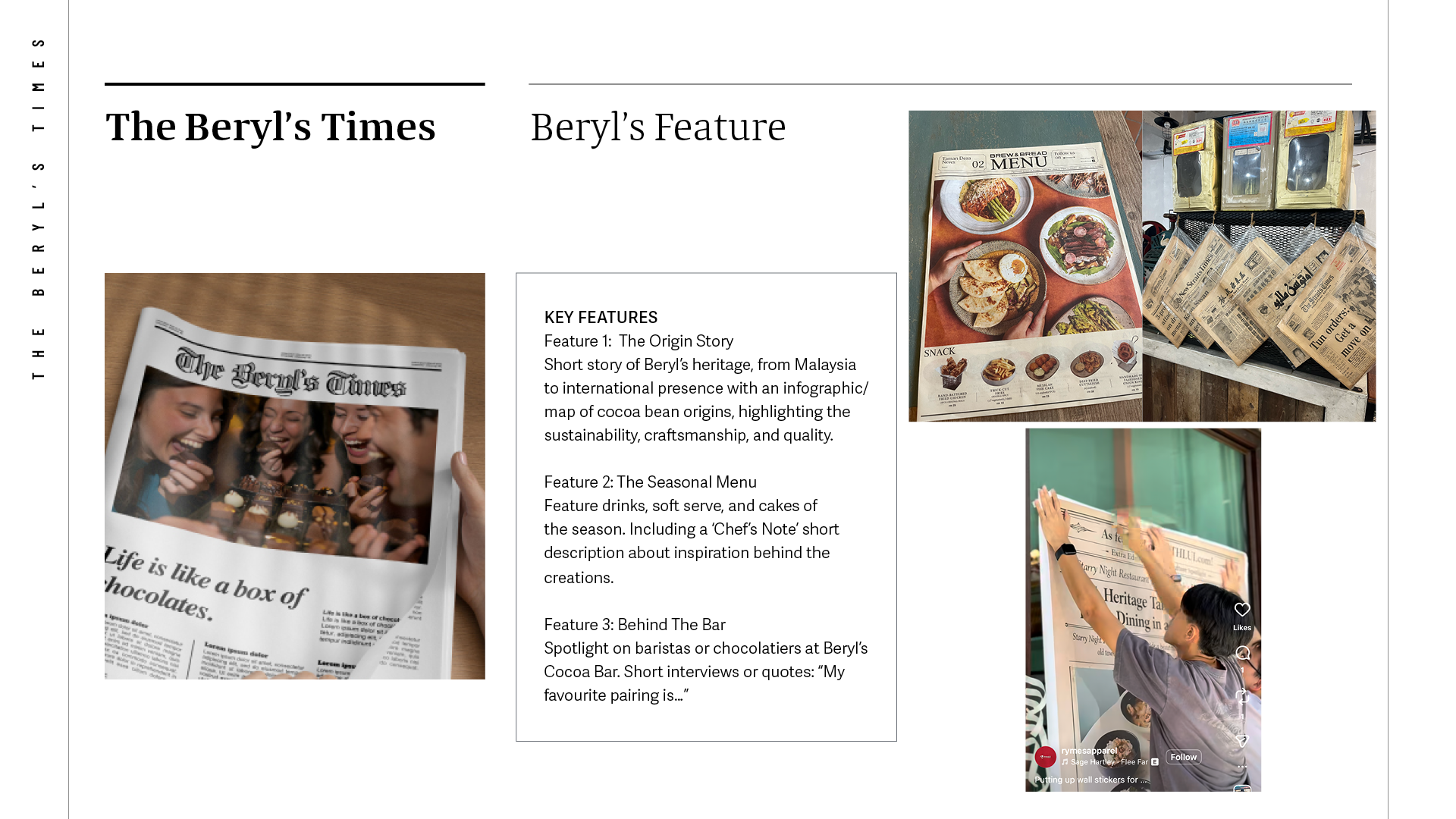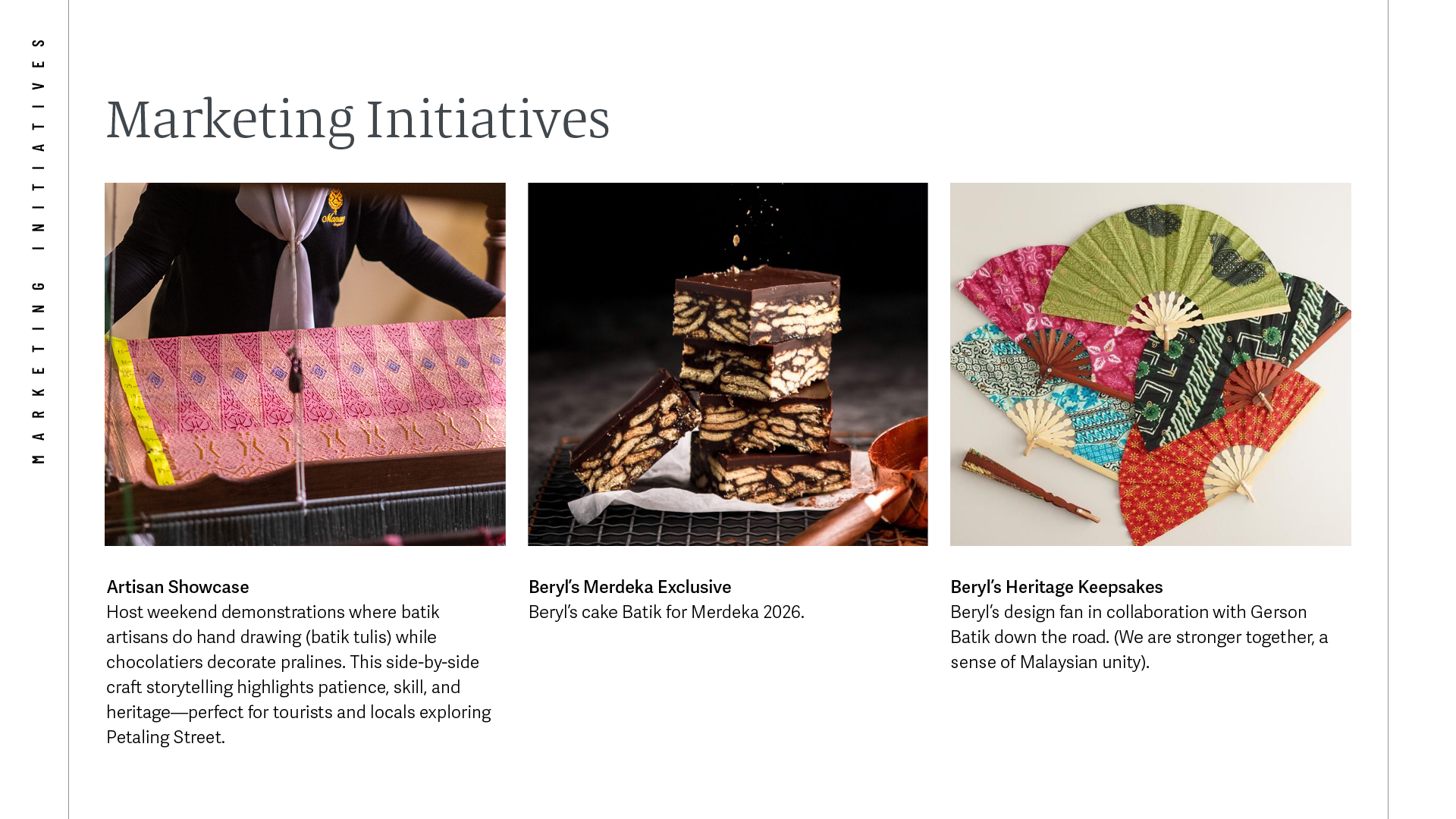 Spearheaded the concept and marketing for Beryl’s Heritage Concept Store in Jalan Panggong, inspired by Malaysian batik elements. Responsible for copywriting, design, and editorial direction of the quarterly newsletter, featuring team recipes and heritage stories.